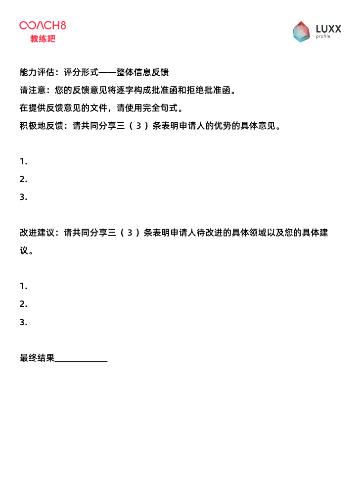 以下是LUXX Profile中国分析师口试打分表,考官会根据此打分表来对现场口试进行打分。考试采取现场录像的方式,所有的考试内容会提交LUXX China进行最终考核。如果出现LUXX China与现场考核导师意见不一致,LUXX China工作人员会与考生做最后复合,以最终LUXX China最终复合结果为准。