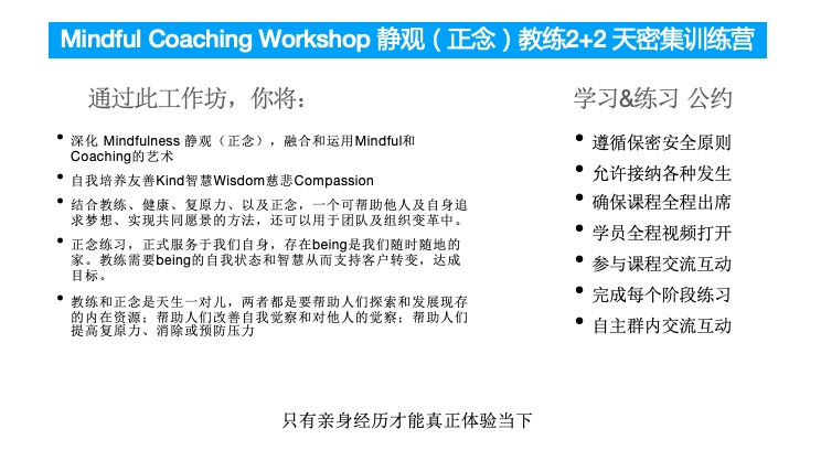◆ 教练和静观(正念)是天生一对儿,两者都是要帮助人们探索和发展现存的内在资源;帮助人们改善自我觉察和对他人的觉察;帮助人们提高复原力、消除或预防压力。