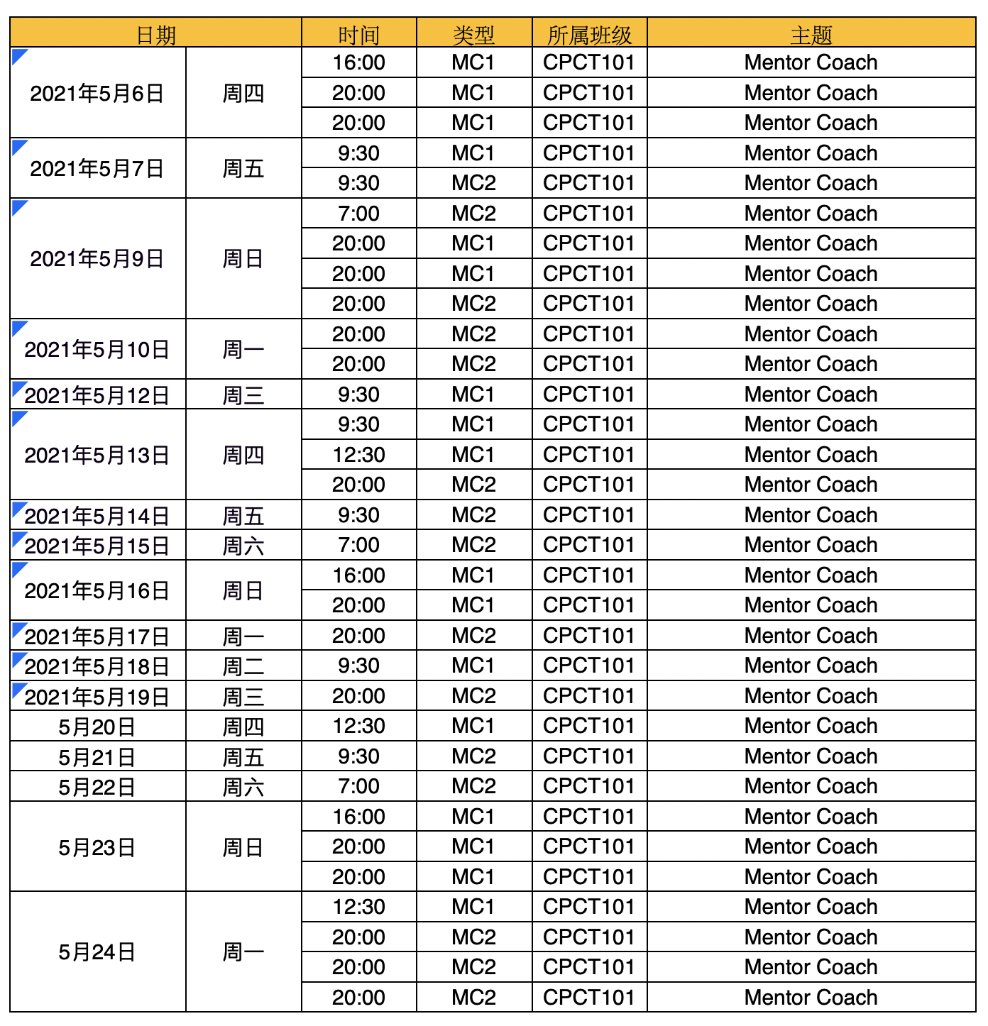 2021年5月MC1、MC2课程时间安排表(CPCT101)