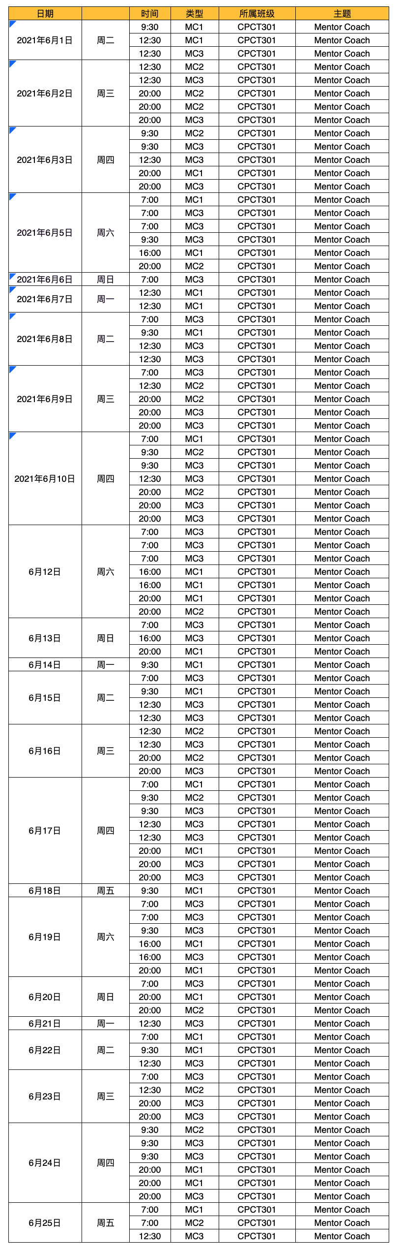 2021年6月MC3及MC(加场)课程时间安排表(CPCT301)