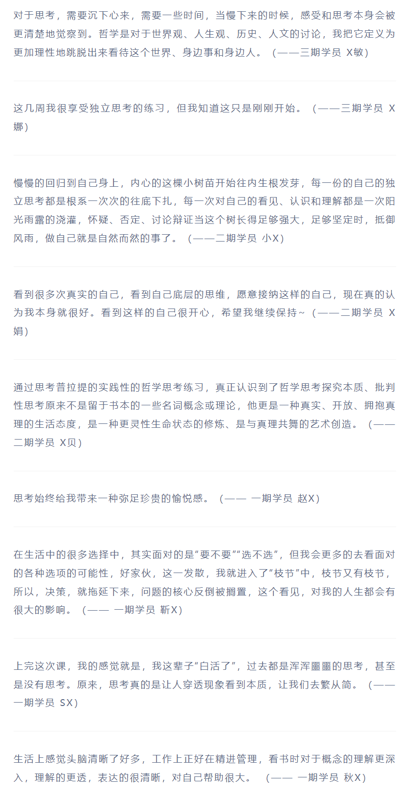 “思考普拉提”课程,将带领你在富有活力的对话中,体会理性思考之美, 锻炼思维的弹性与韧性,透过生活的表象,探寻生命的本质,从而更深刻地理解自己、他人与世界,过一种更为平和、自在、幸福的生活。
