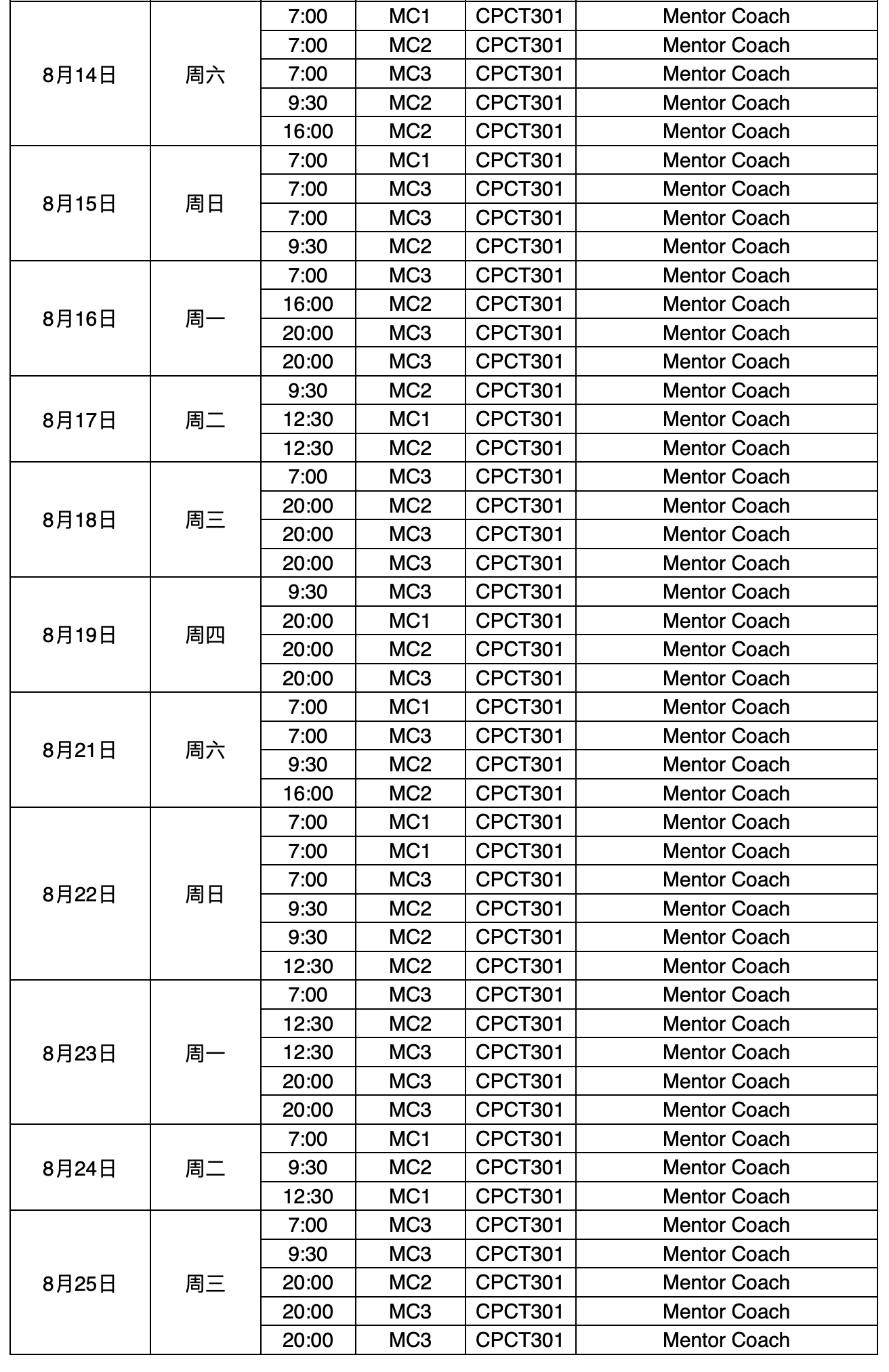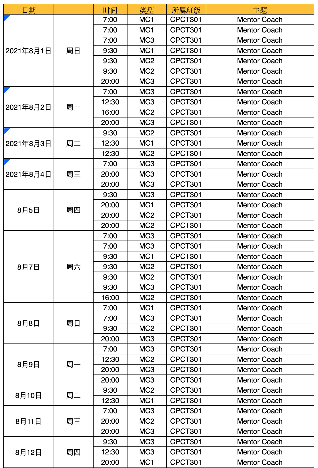 2021年8月MC3及MC(加场)课程时间安排表(CPCT301)