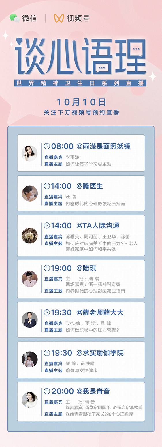 「活动」10月10日七位大咖共同助理微信视频号《世界精神卫生日》活动