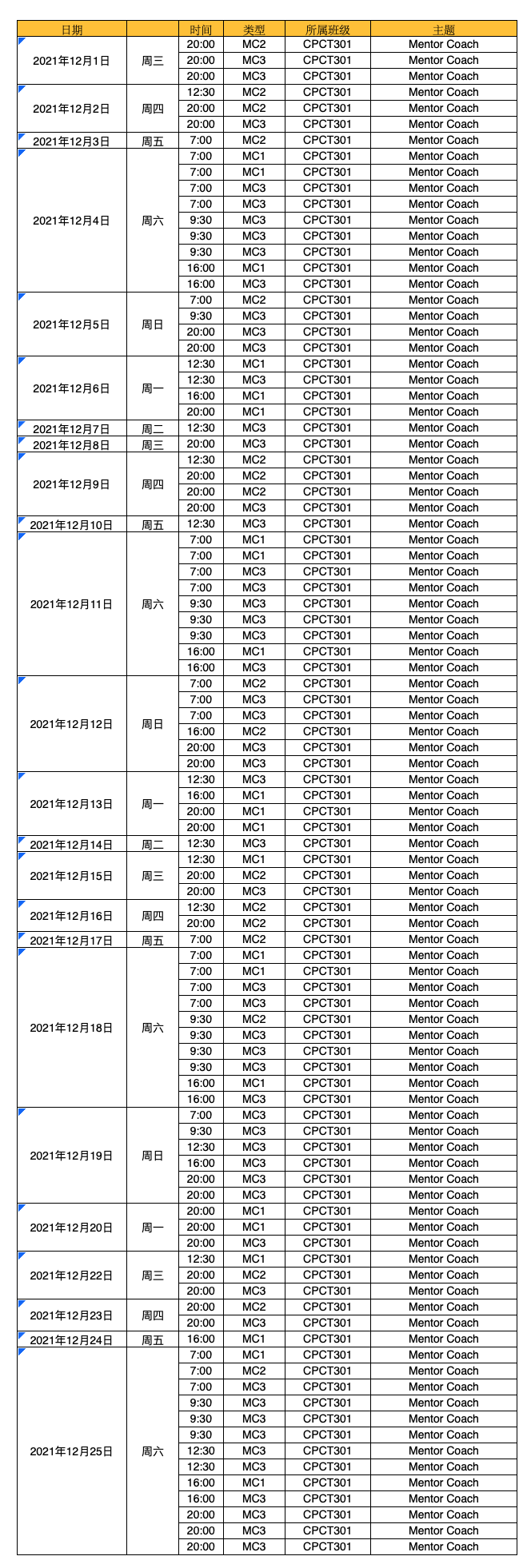 2021年12月MC3及MC(加场)课程时间安排表(CPCT301)