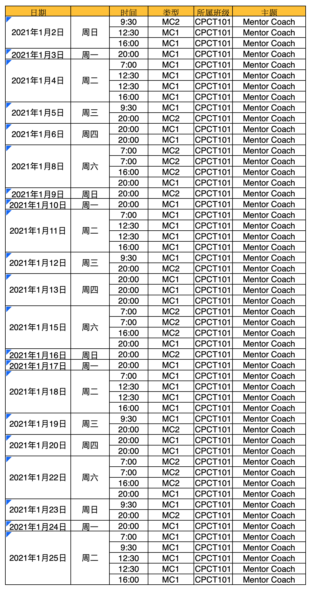 2022年1月MC1、MC2课程时间安排表(CPCT101)