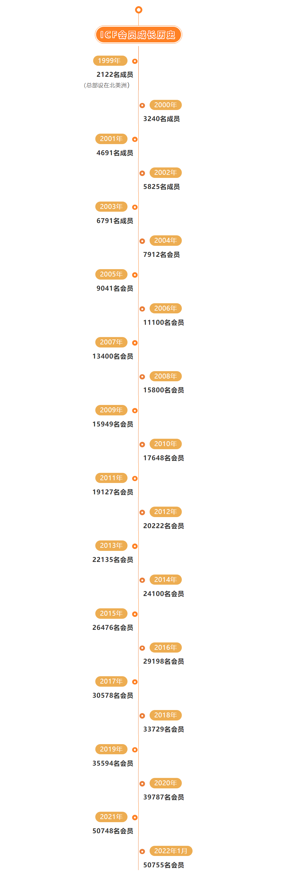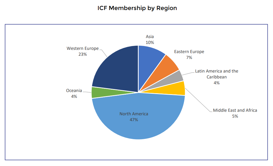 ICF在156个国家和地区拥有50755个会员(较上月增长2321人),在80多个国家拥有超过143个分会(ICF分会是用来发展ICF成员及线下活动的公益性组织)。