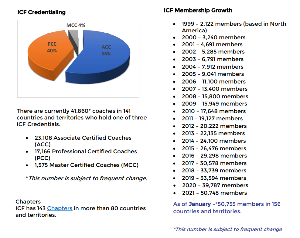 ICF将“教练”定义为与客户在发人深省和富有创造性的过程中进行合作,激发他们最大限度地发挥个人和专业潜力。 (以下数据都是截止到发稿日的统计,数量会随着日期的变化而发生变化。)