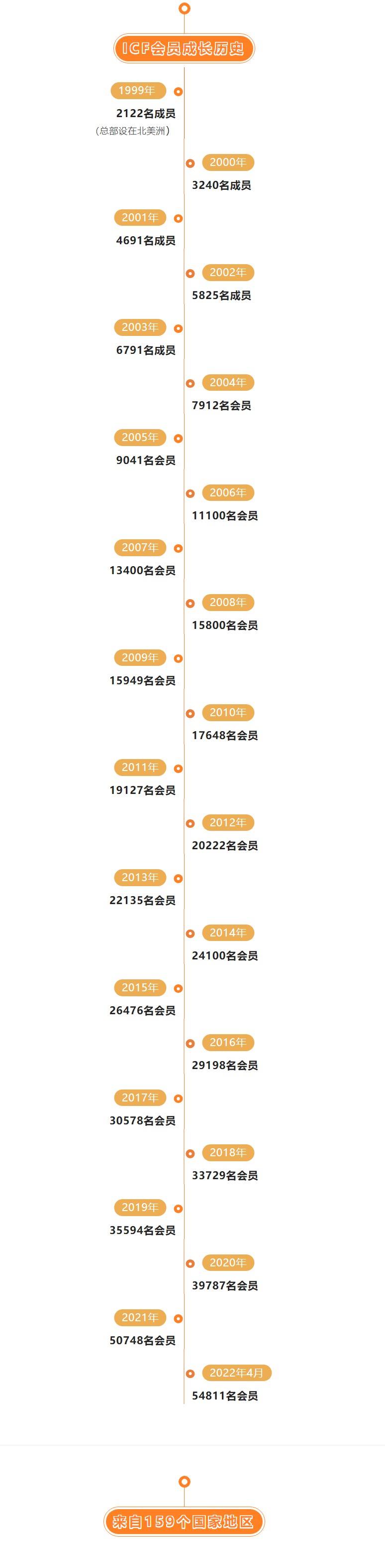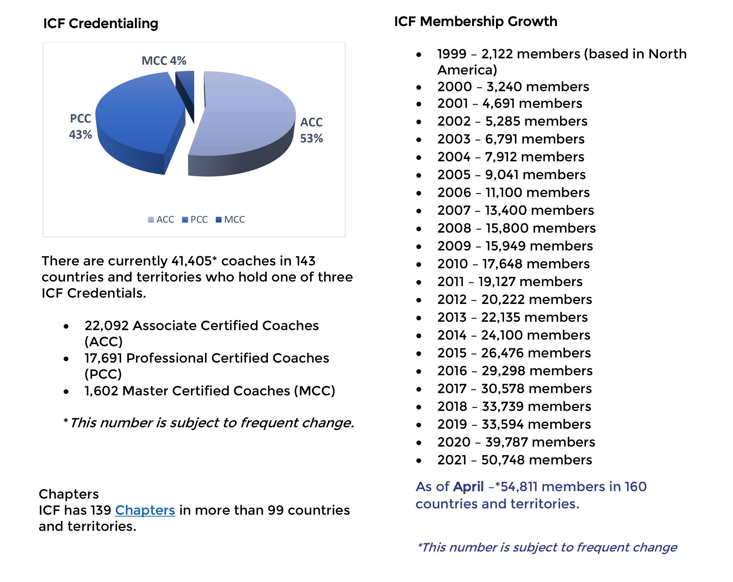ICF在160个国家和地区拥有54811个会员(较上月增长1661人),在99多个国家拥有超过139个分会(ICF分会是用来发展ICF成员及线下活动的公益性组织)。