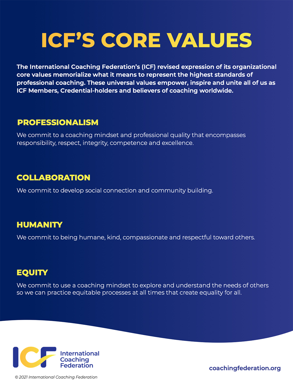 As ICF Professionals, we aspire to uphold these universal values. Our values also serve to unite all ICF Coaches around the globe. ICF Professionals ensure professional and personal conduct is consistently aligned with the ICF Core Values. As professionals, we use the ‘coaching mindset’ of being open and non-judging in all interactions and accept our duty to speak up and make our voices heard when we witness any behavior that goes against the ICF Core Values and the ICF Code of Ethics.
