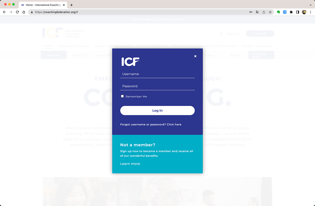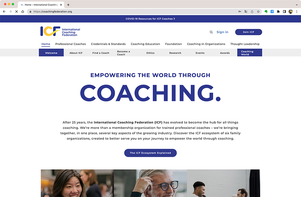 首先打开浏览器(如果要稳定最好使用Chrome浏览器),然后输入ICF的网站:https://coachingfederation.org 。注意这个网站原来访问是有点限制的,后来ICF做了调整,但是有一些网页区域的显示还是有问题,所以如果遇到一些地方是空白就请自动忽略。
