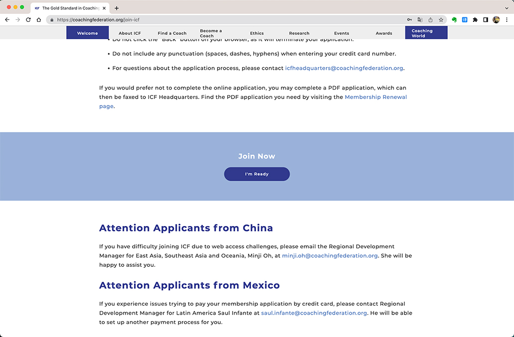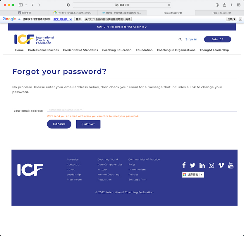 自2020年开始,ICF(国际教练联盟)开始对网站进行逐步的改版。特别是2019年到2022年ICF对《核心技能》(也称作ICF核心能力)和《道德准则》进行了更新,并且也推出了ICF《团队教练核技能》,并且对ICF组织进行了大规模的改革后,ICF的网站的各种注册、申请功能都发生了很大的变化。Coach8根据这种变化,给大家整理一系列的如何注册会员、如何重新申请会员找回密码、如何申请ACC、PCC和MCC和如何Renew(更新)ACC、PCC、MCC的手把手教程,按照这个教程的步骤,几乎可以很快的完成想要做的工作。