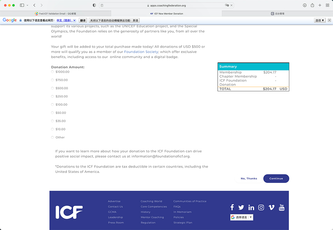 接下来这个页面是关于费用,ICF会员的费用是每年245美金,根据你注册的时间它会进行扣除,一般是以每年三月份作为起始年,然后接下来每个月都会相应的扣除一部分费用,知道接下来的新的一年。这个页面必须要理会,直接点击底下的“No,Thanks”这个页面主要涉及到一些赞助除非你想,否则就按照我的指令点击。