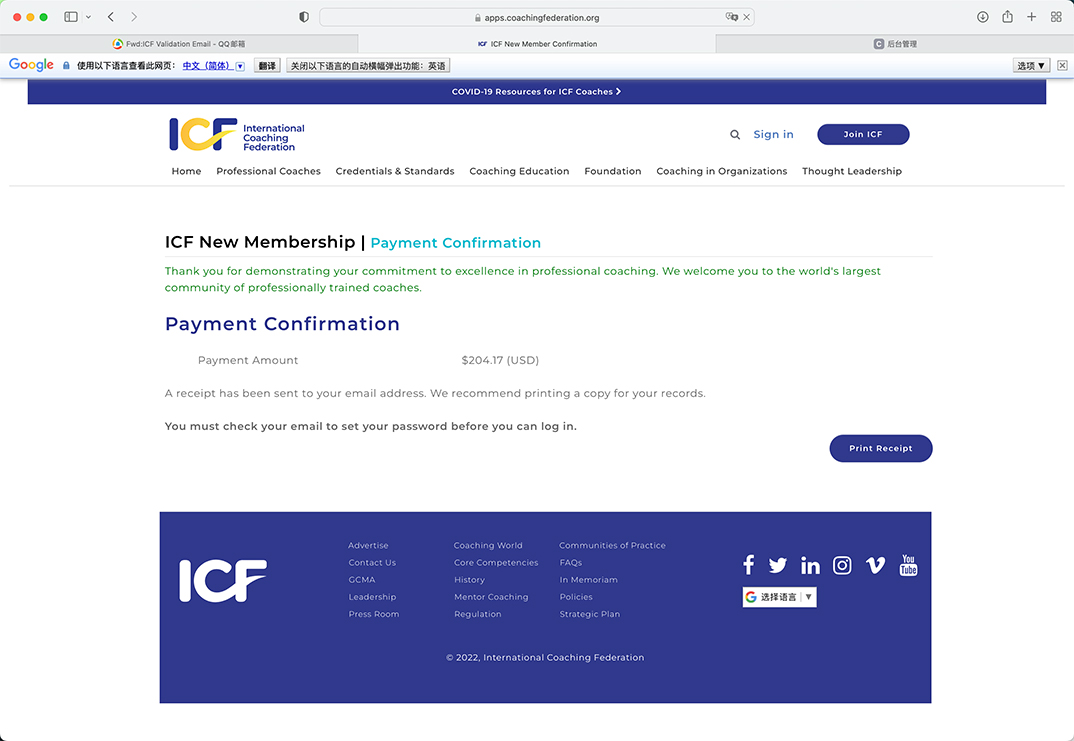 于是进入下面的页面,这个代表你的付费已经完成,底下蓝色按钮 Print Receipt是打印收据(发票)的按钮,可以下载ICF提供的点子发票报销之类的