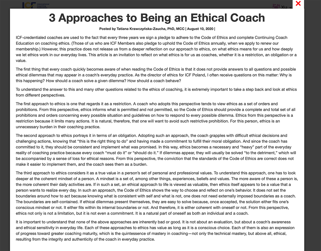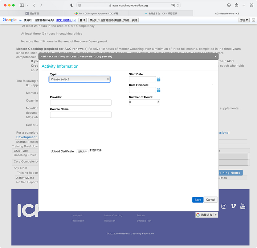 获得过ICF认证的人都知道ICF要求认证教练每三年要更新一次证书,具体的需求是40个小时的CCE教练再教育学时,其中必须要有3小时的关于道德准则的CCE学时。很多人可能不知道ICF会提供免费的3小时培训时数,只要你花时间就可以拿到的。下面就是图片的示意图: