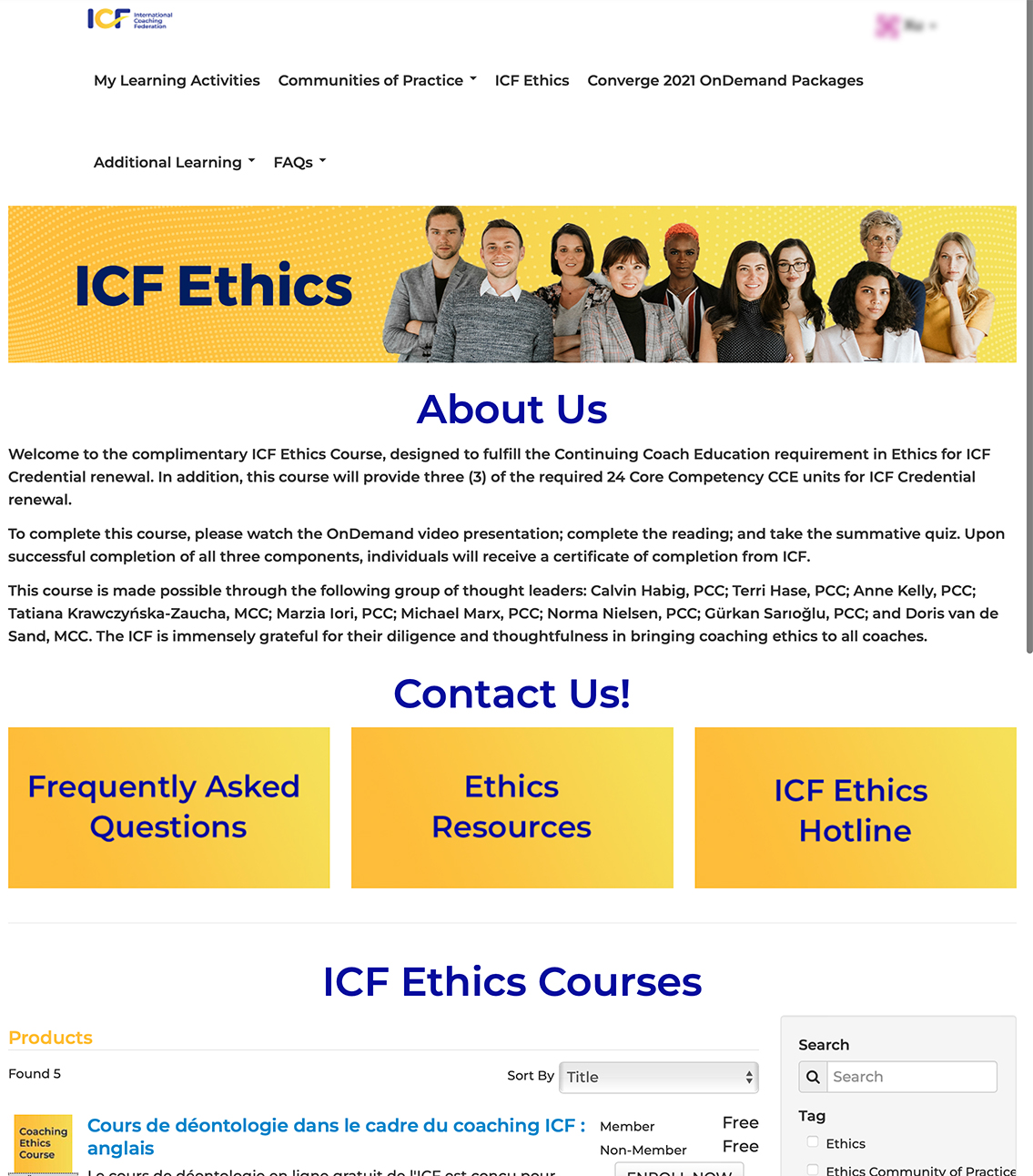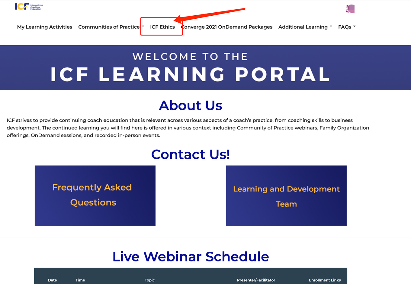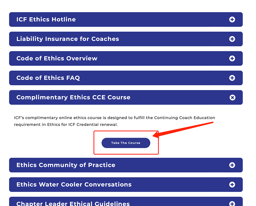 首先进入ICF的网站,然后点击顶部选项卡的Ethics 字样,底下的 Ethics Resources 字样,然后可以看到下面的图片,然后点击红色箭头的Coplimentany Ethics CCE Course 选项卡