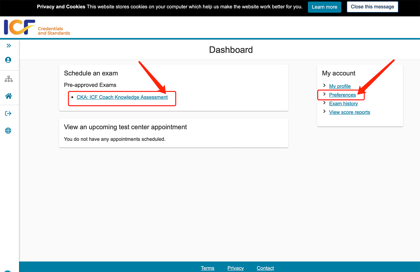 2021年,ICF(国际教练联盟)对旗下认证教练模块的CKA考试进行了升级。CKA考试的全称是 ICF Coach Knowledge Assessment Exam (CKA) ICF教练知识评估考试(CKA)。很多人对这个流程如何做不是很清楚,所以今天我们来给大家讲一下这个流程和网站的界面。首先关于如何申请ACC、PCC请查看我们以往的文章 (/site/article_detail/id/1538) 。然后用会员身份登录,点击下图右下角红色框和红色箭头的地方。