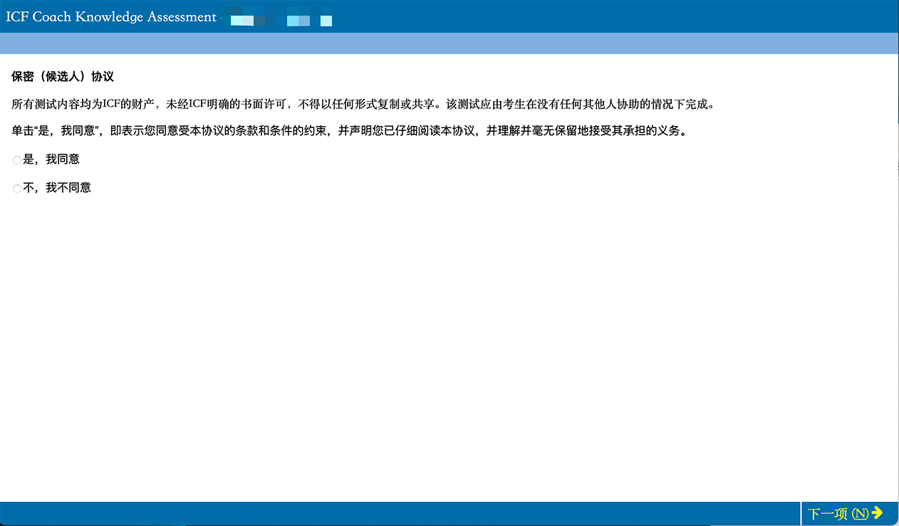 点击进入以后,可以看到如箭头所示的文字,这些都是对考试的基本介绍,请点击左边红框的 CKA:ICF Coach Knowledge Assessment 字样。