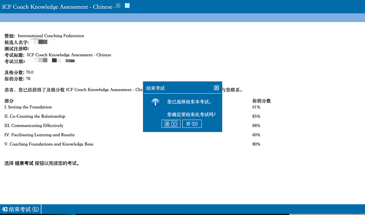 弹出窗口点击 是 结束考试。结束后会出现考试成绩考试就结束了,接下来就是等待ICF确认的邮件了。