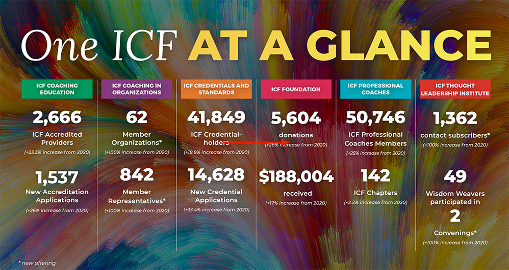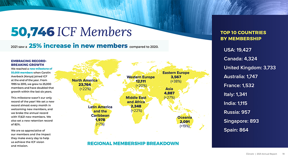 2021年,国际教练联合会继续通过新举措、额外的转型和打破记录的里程碑来领导全球教练的进步,包括全球超过5万名活跃的ICF成员。