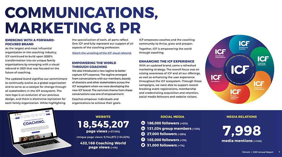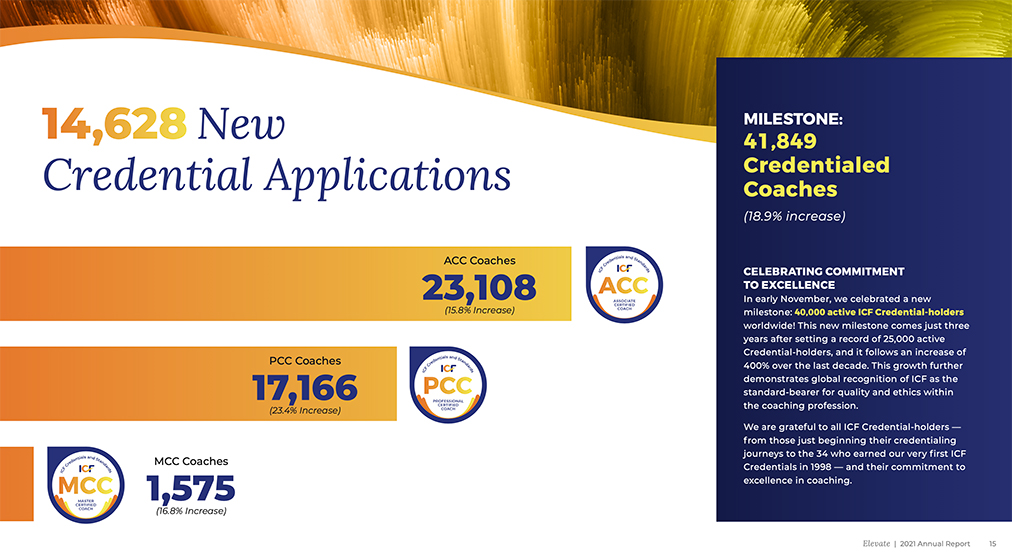 阅读更多关于ICF社区如何在2021年年度报告Elevate(https://coachingfederation.org/app/uploads/2022/07/ICF_2021_AnnualReport.pdf)中突破极限,促进积极变化,以及我们共同完成的所有工作。