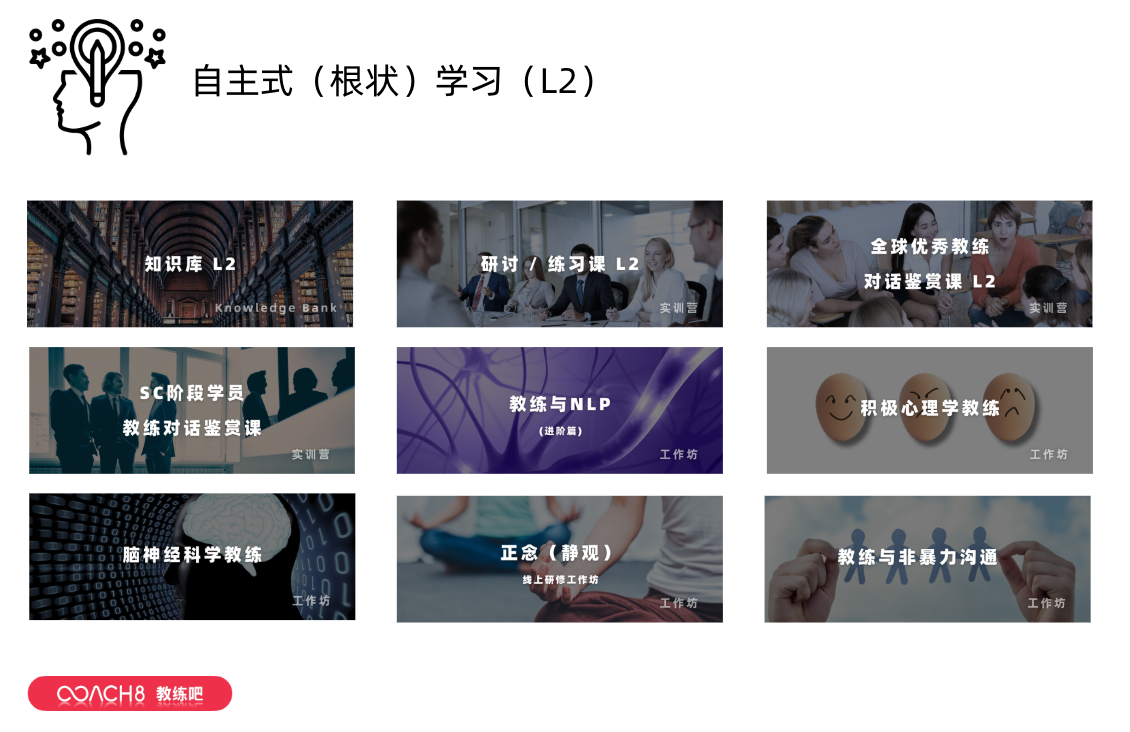 自主式学习:自主式学习在 Coach8是一个单独的教练学习项目我们称它为“Coach8 教练学习成长俱乐部“。自主式学习又被我们称为“根状学习法”。就如同它的名称一样,根状学习就像一棵大树的根系,它是真正能给人带来滋养的源泉。自助式学习(根状学习)关键是通过不同的知识点的摄入,让自己对于树状学习中的理论有更加深入的理解和认识。从教育学的角度来看,知识的纵横打通是最有利于人去理解和应用知识的。所以根状学习,即打破了时间、空间的限制,打破了班级、课程、老师的限制(就如同大学拆除了围墙一样的开放),设置众多的教练可能会涉及的知识外延或者技能方法,让学习者如同拥有了一座图书馆、丰富多样的选修课堂、具有跨领域的研讨会议室、让自己不断提高的实训营等。根状学习让学习打破了学科、专业、流派,也从另一个维度打破了单一的老师、单一知识方向的输入、单一的班级学员的各种限制,大家可以在自主式学习(根状学习)模块,认识更多志同道合的学习同侪、了解更多关于教练的方向和发展的可能、扩大大家的知识外延等等。其中,实训营、工作坊、研讨/练习课 、教练与测评、企业教练、教练事业社群都是针对根状学习法所设计出的学习模块。