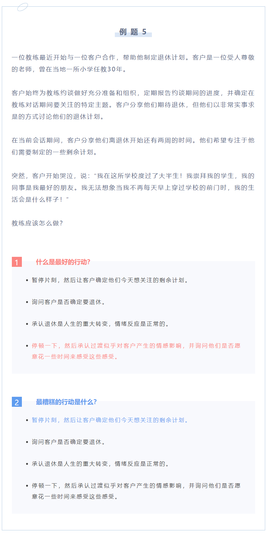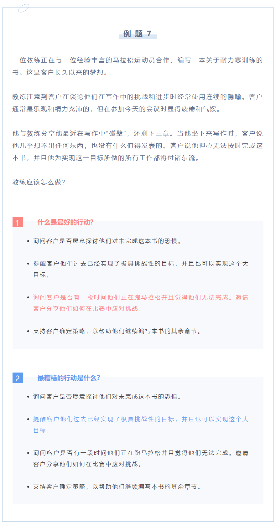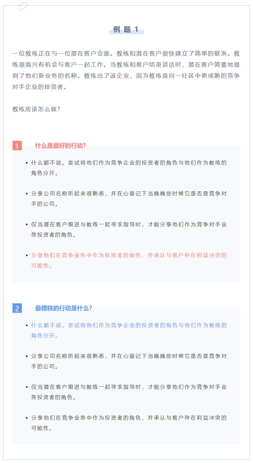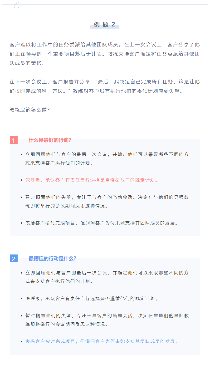 ICF提供了8道例题,我们将最佳行为和最差行为的正确答案标注出了颜色: