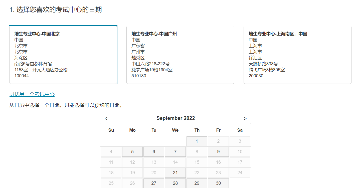 在搜索框中输入CHINA,选择你希望前往的城市,考试中心设在北京、上海、广州、沈阳、西安、香港、台北,你可以选择3个城市看哪个城市的考试时间更合适自己。