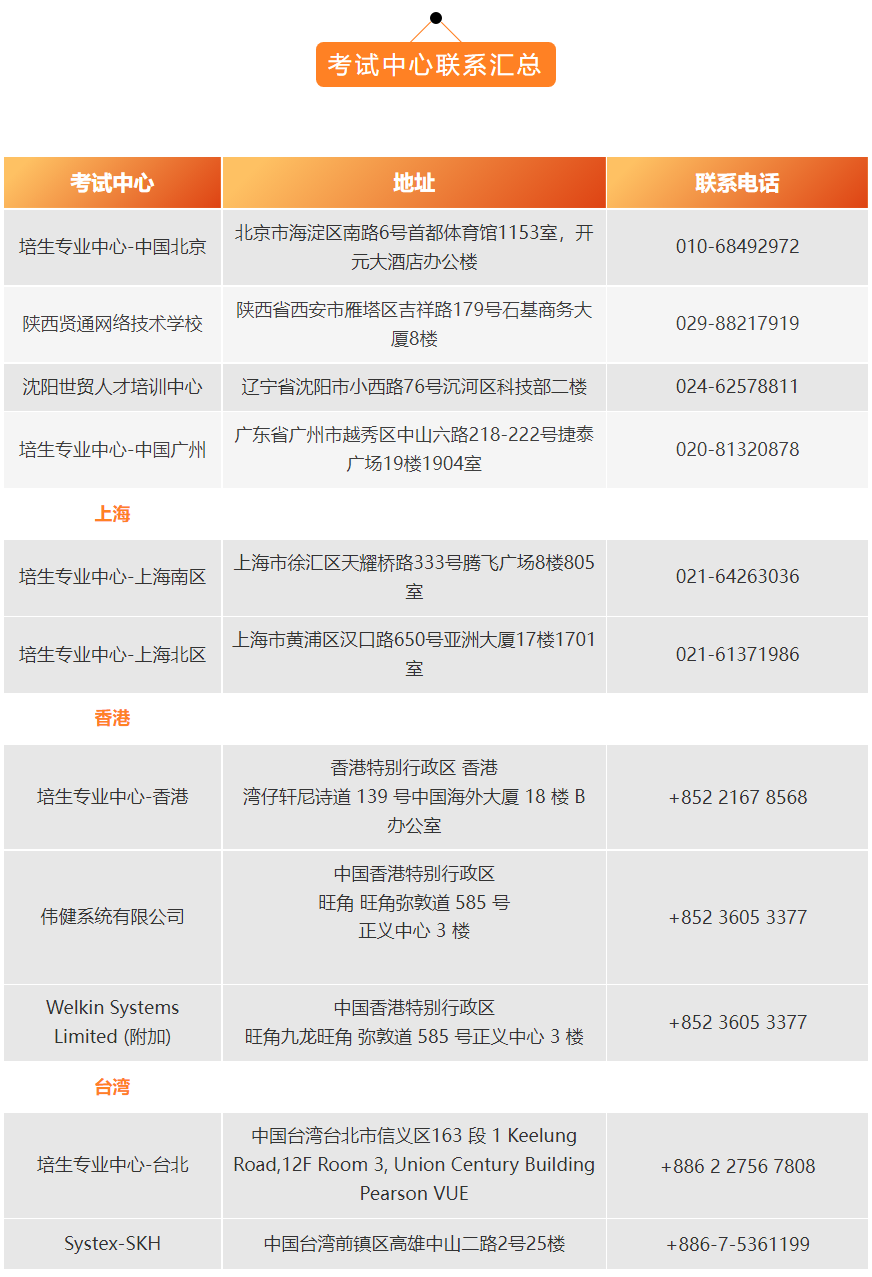 1、目前,中国考生需要在指定的Pearson VUE的考试中心进行线下机考考试(考试中心设在北京,上海,广州,沈阳,西安,香港,台北)。