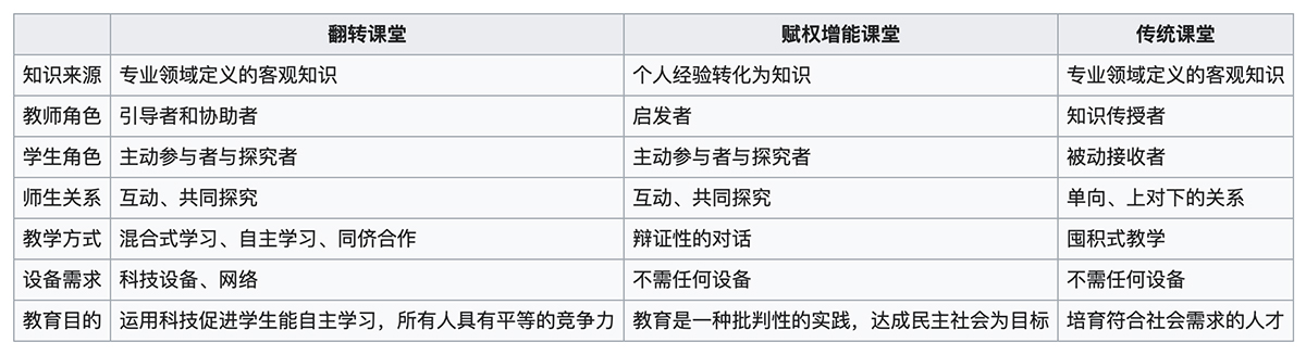 “翻转课堂”的出现虽具有划时代的意义,但仍有着教师进行数位课程转化的挑战、落入强化追求标准化教育目标的可能、忽略影响个体学习成效因素之复杂性、以及教育与商业过度紧密结合的潜在危机等问题待厘清与克服。“翻转课堂”的理念与批判教育学中理想的“赋权增能课堂”有几分相似之处,对照传统课堂之比较如下表所示。