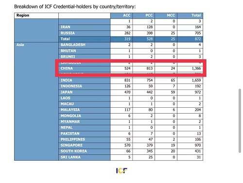 截至2022年9月9日,ICF统计中国ICF认证教练证书持有者1366人,其中ACC教练524人,PCC教练813人,MCC教练24人。