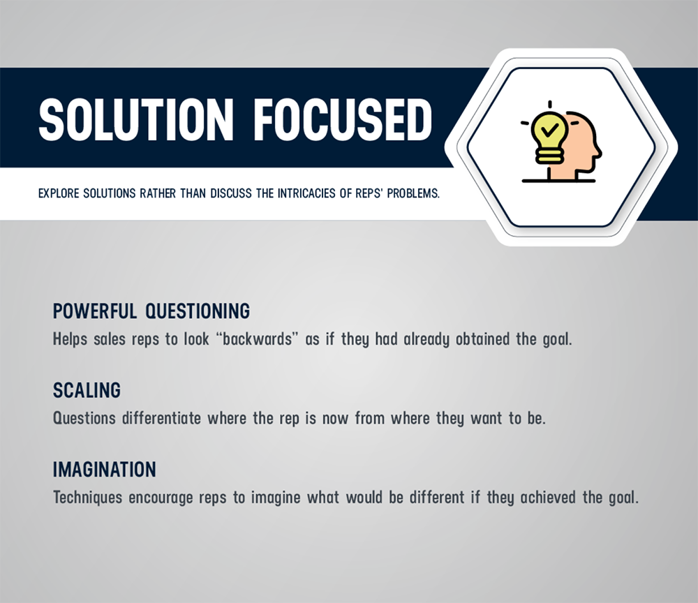 以解决方案为中心的销售辅导模式侧重于与销售代表一起探索解决方案,而不是讨论所遇到的问题的复杂性。总体想法是,这些技术有助于员工可视化最终目的地,以便他们可以为到达该点的旅程构建指南。