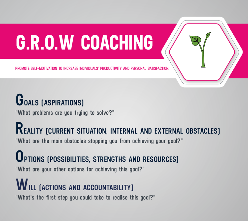 让我们进一步详细探索 GROW 模型首字母缩略词,包括教练可以询问哪些问题,以便最恰当地利用这个模型: