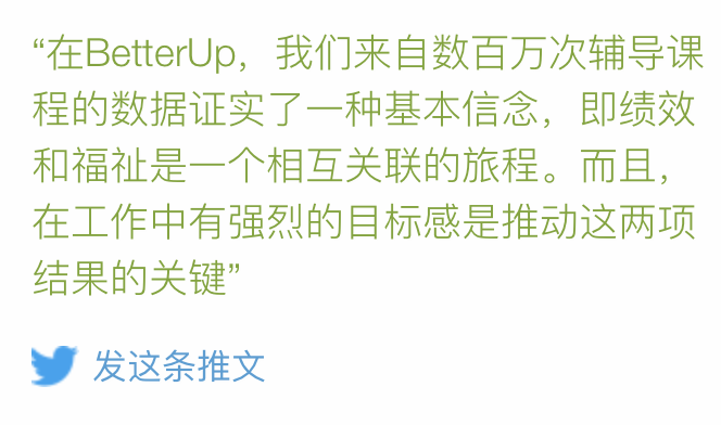 BetterUp Labs于2018年推出,是一项2000万美元的投资,也是首个将商业、学术界和科学聚集在一起的行为研究实验室。Labs拥有一支由40多名博士组成的团队,嵌入BetterUp组织,在组织心理学、行为神经科学和社会心理学方面带来了专业知识和创新研究技术。实验室团队致力于进行经过验证和同行评审的研究,并从世界上最大的教练以及个人和职业成长实时数据集中了解持久的行为变化。BetterUp Labs发布了关于意义和目的、归属感、联系和未来思维领导力(展望)主题的尖端研究,以及它们与人类转型的关系。要了解更多信息,请访问www.betterup.com/research。