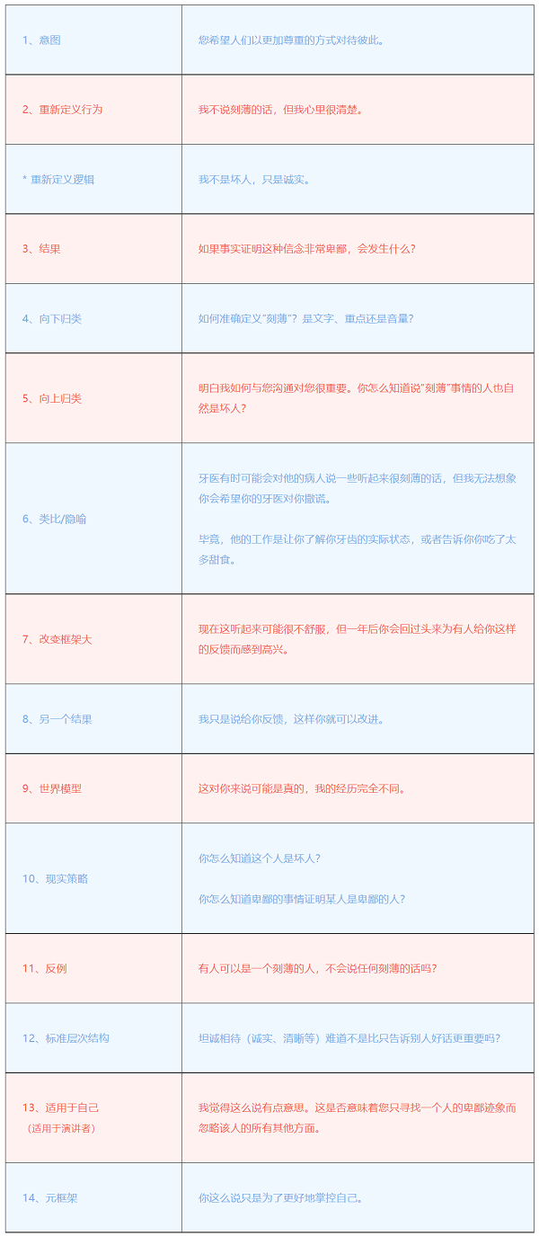 Sleight of Mouth 模式包括14种不同类型的语言重构,这使我们能够将我们对世界的概括和心智模型与我们的经验和我们信念的元结构(内部状态、期望和价值观)的其他方面重新联系起来。