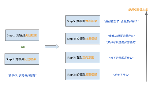 结合上面的案例,可以看到,运用上面的模型,关键的开启点在于,觉察到我们在使用负面的失败框架或者问题框架,而且有意愿去改变。这一步的识别,来自于我们敏锐的觉察力。