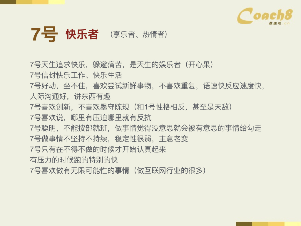 快乐者(七号)追求快乐,避免痛苦是他们最大的特点。他们通常被认为是天生的娱乐者,具备出色的表演能力。然而,这些艺术家的表演能力并不只是靠情绪驱动,背后还有着丰富的理论和逻辑基础。他们对工作和生活都充满了兴奋和快乐。