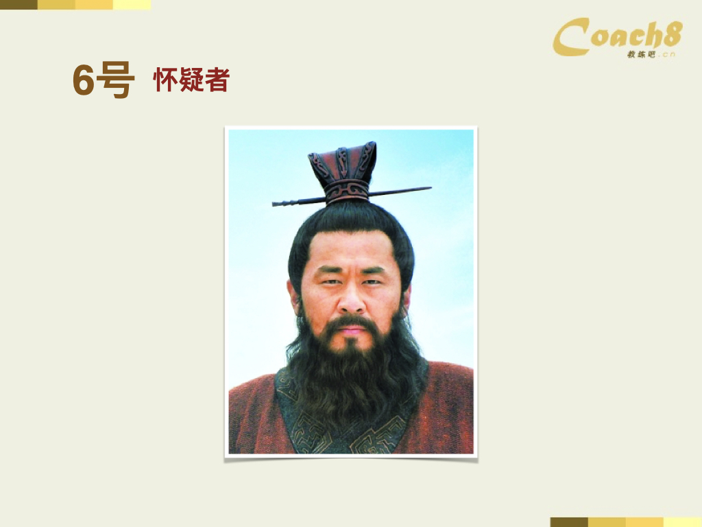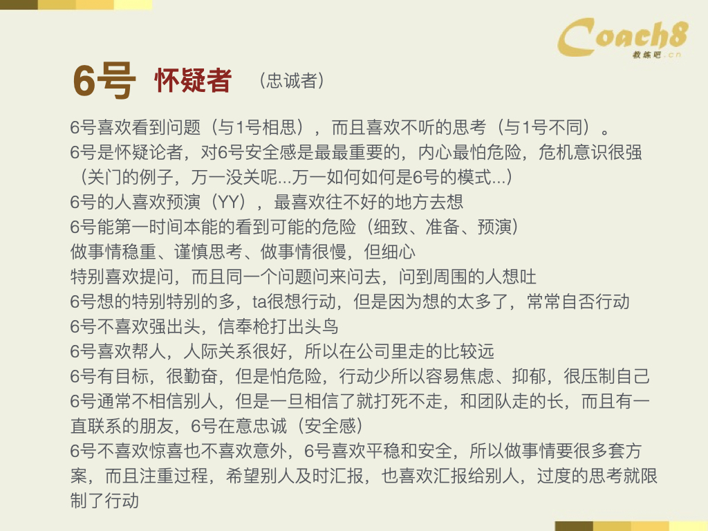 接下来,我们将继续学习九型人格中与智力和思考逻辑相关的部分,即六号。在九型人格中,六号是一个非常有特色的类型。在我们的生活中,六号类型非常常见。我们将其称为"怀疑者"。曹操是一个典型的六号代表人物。他在《三国演义》中有一句经典台词:"宁教我负天下人,休教天下人负我"。这句话体现了他内心的怀疑感。然而,我们要注意,六号并不是一个完全负面的类型。我们了解到的曹操是被演绎过的形象,他并不是一个坏人。六号类型的人内心倾向于怀疑,但听起来好像不是一个好的特质。然而,我们称六号为"忠诚者",因为他们内心非常激烈,却不会表现出来。六号喜欢思考问题,但不一定会直接说出来。与一号喜欢指出问题不同,六号更喜欢内心冲突。他们有很多问题,但不像一号那样直接说出来,而更像一种内心的愤青。