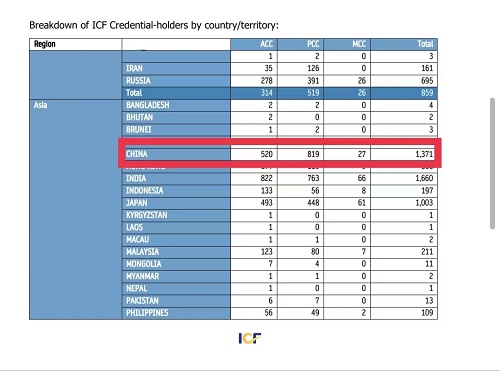 截至2022年11月4日,ICF统计中国ICF认证教练证书持有者1371人,其中ACC教练520人,PCC教练819人,MCC教练27人。