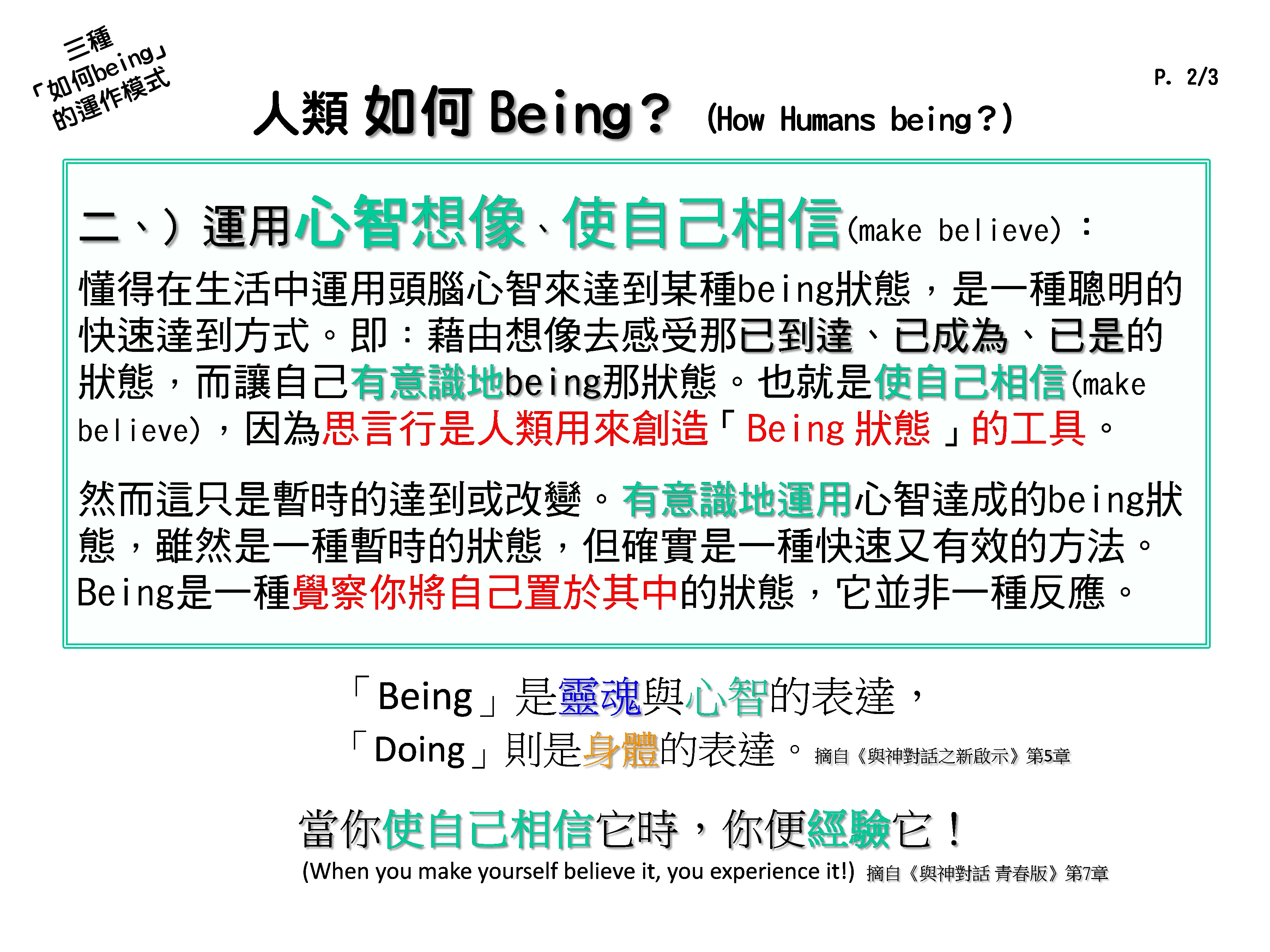也就是「使自己相信」(make believe),因为思言行是人类用来创造「Being状态」的工具。