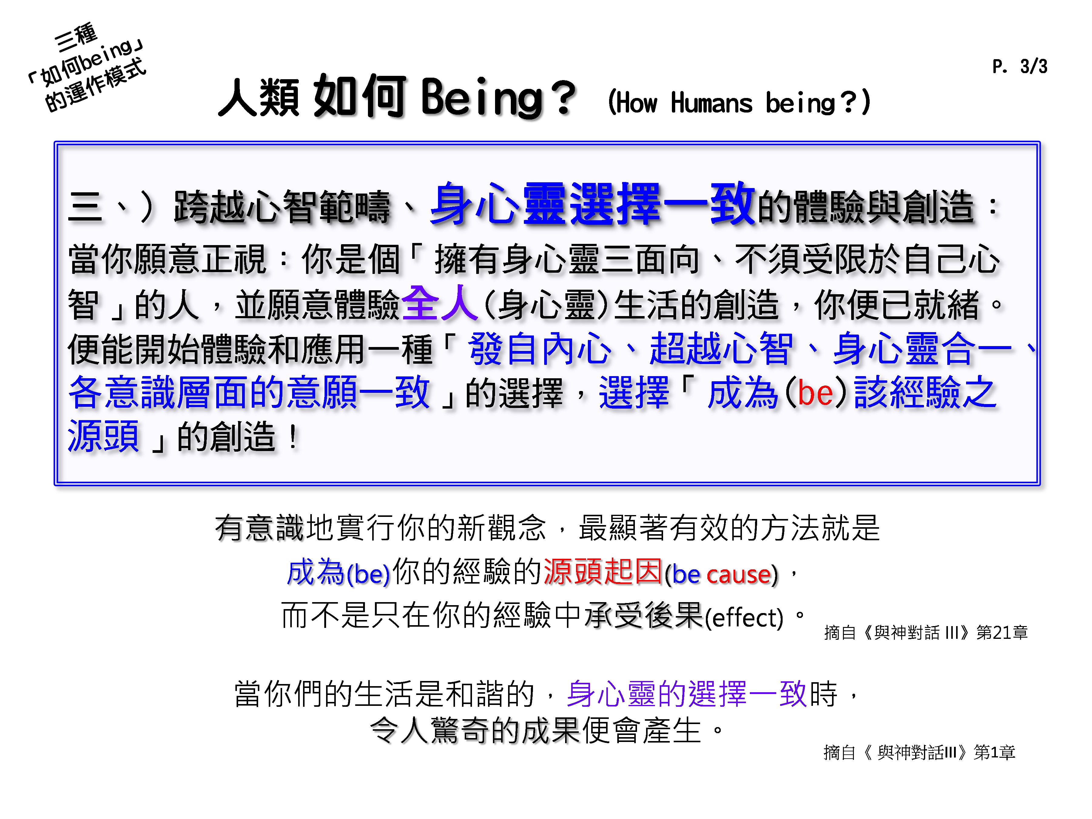 当你愿意正视:你是个「拥有身心灵三面向、不须受限于自己心智」的人,并愿意体验全人(身心灵)生活的创造,你便已就绪。便能开始体验和应用一种「发自内心、超越心智、身心灵合一、各意识层面的意愿一致」的选择,选择成为(be)该经验之源头」的创造!