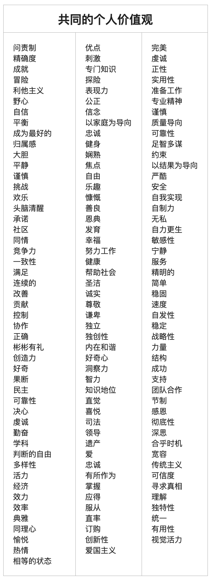 这个步骤可能是最困难的,因为你必须深入审视自己内心。这也是最重要的一步,因为在做出决定时,你必须在可能满足不同价值观的解决方案之间做出选择。你必须知道哪个价值对你来说更重要。