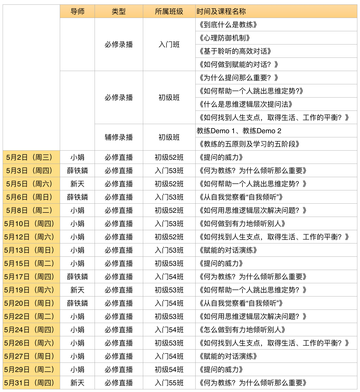 2018年5月入门、初级班课程时间安排表