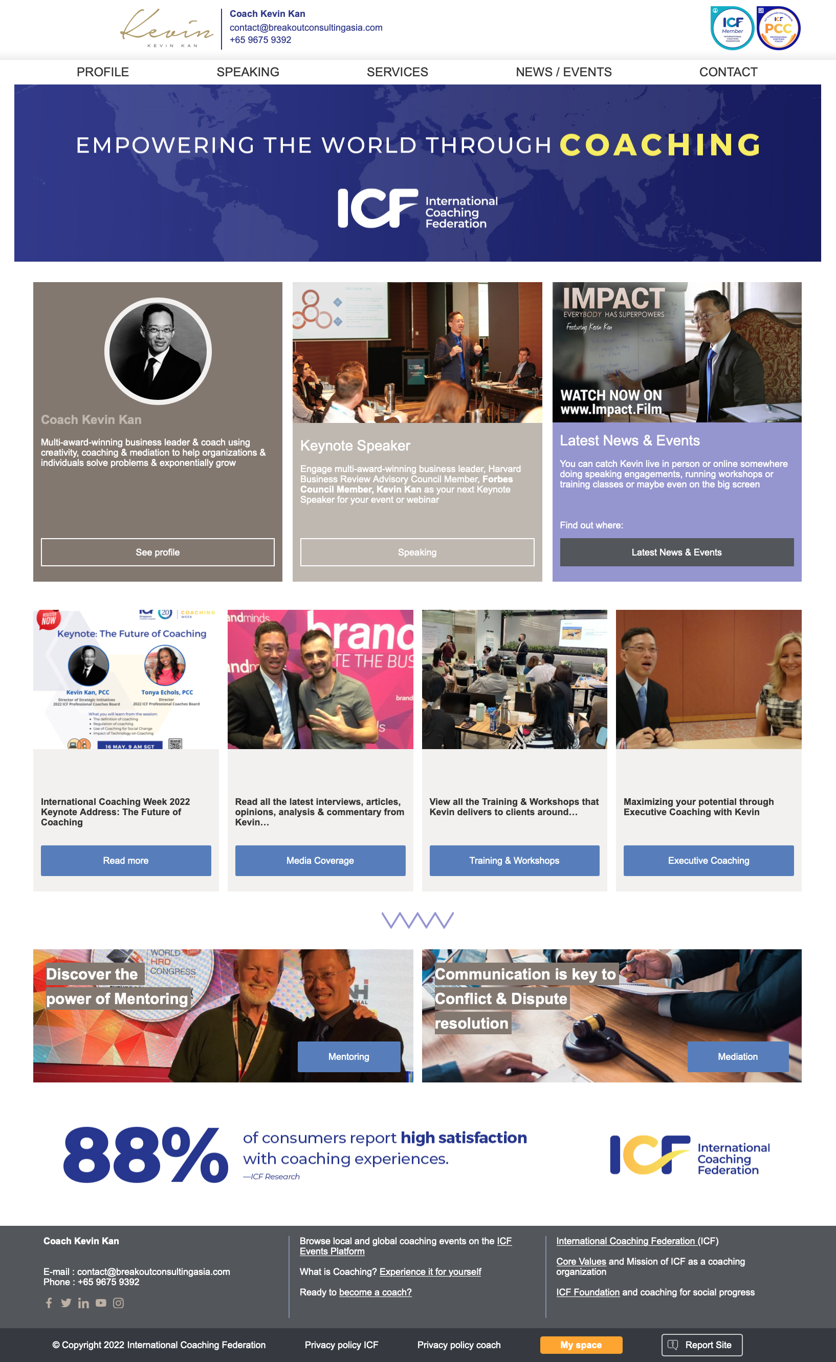 11月底,ICF为了更好地服务全球ICF注册会员,增加ICF会员的含金量,ICF全球董事会副主席Coach Kevin Kan开通其ICF专属网站(点击这里进入网站)。大家可以透过点这里观看他的主页。据悉,自从ICF推出此项服务,已经在全球范围内做了多次线上研讨活动,普及和推广如何建立和使用ICF的专属网站(点这里进入英文视频讲解)。并且推出了使用手册(点这里查看英文版),手把手的教大家如何使用。相信在2023年,每一个ICF教练都拥有一个自己专属的ICF网站会成为教练圈的一个潮流。未来Coach8会针对此模块在宣讲会模块进行更专项的内容简介。