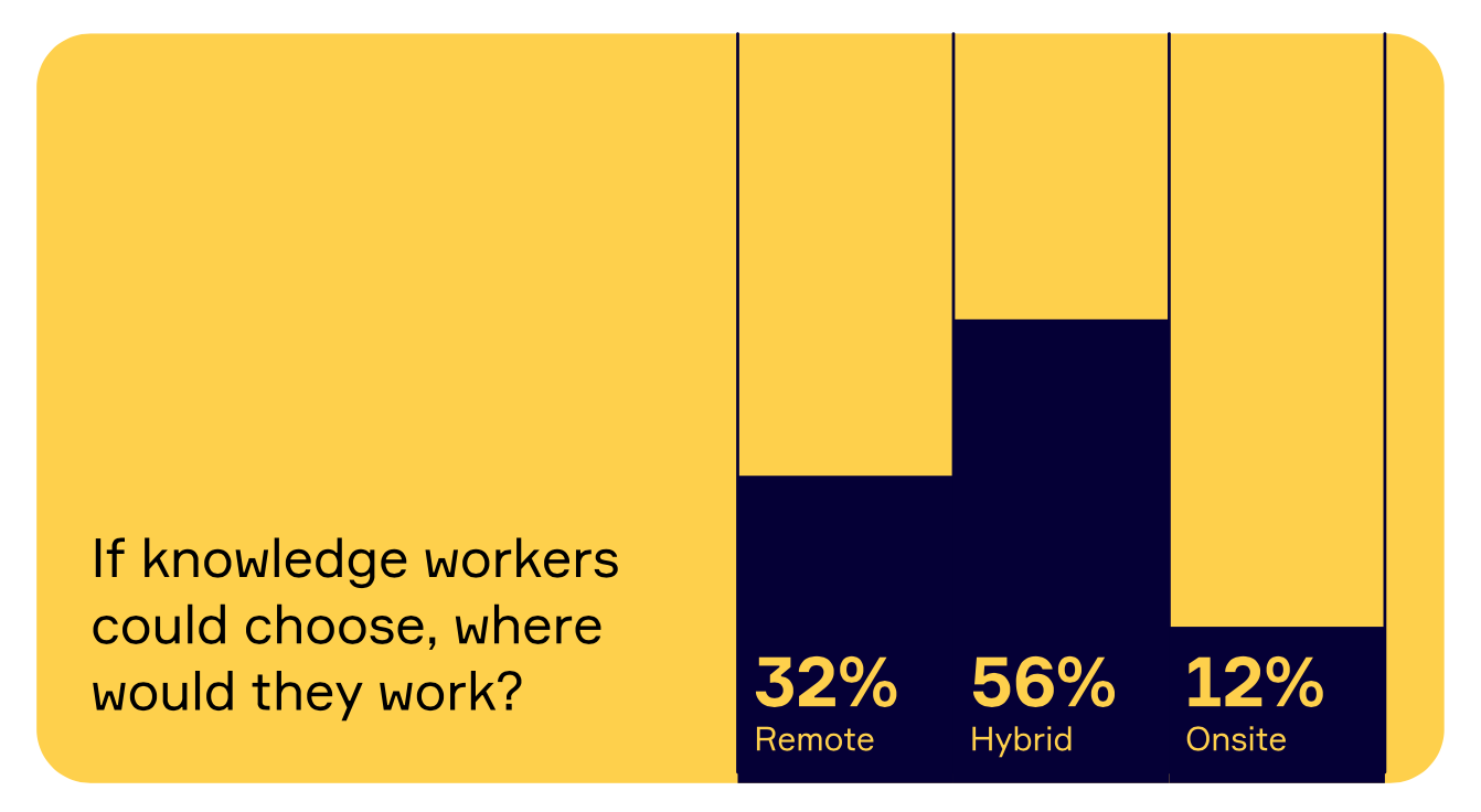 69%的混合型员工在理想的工作环境中工作,相比之下,46%的员工在远程工作,20%的员工在现场工作。