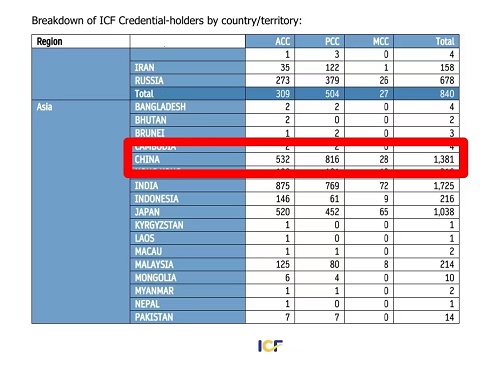 截至2023年1月10日,ICF统计中国ICF认证教练证书持有者1381人,其中ACC教练532人,PCC教练816人,MCC教练28人。