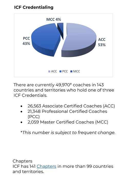 截至2023年2月6日,在全球143个国家和地区里,有49970名教练持有三类ICF认证教练证书。其中——