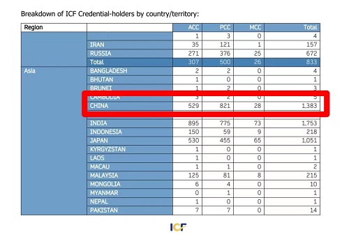 截至2023年2月6日,ICF统计中国ICF认证教练证书持有者1383人,其中ACC教练529人,PCC教练821人,MCC教练28人。