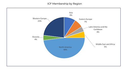 ICF在170个国家和地区拥有57563个会员,在99多个国家拥有超过141个分(ICF分会是用来发展ICF成员及线下活动的公益性组织)。