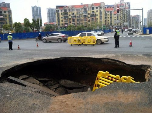 人行道上有一个深洞。