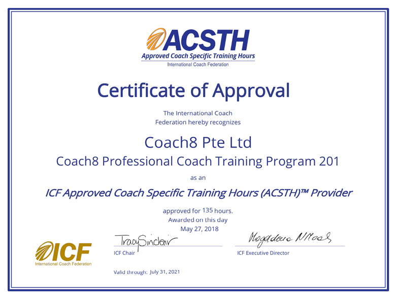 继2017年Coach8独立申请获得ICF(国际教练联盟)认证的60小时的ACSTH项目的认证后,2018年5月Coach8又再次获得ICF认证的135小时ACSTH认证资质。这就意味着Coach8获得了培训学员并且颁发ICF认可的135学时的资格,毕业后的学员就可以申请专业的PCC认证证书!Coach8经过四年不懈努力,致力于走正规专业化的国际教练标准的路线,4年里培养了上千个教练,通过不断的努力和改革,为教练技术在生活中的应用不懈的努力!相信在未来的日子里,Coach8会在教练事业在中国的发展中起到更加正面、积极的重要作用!